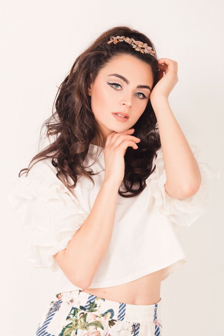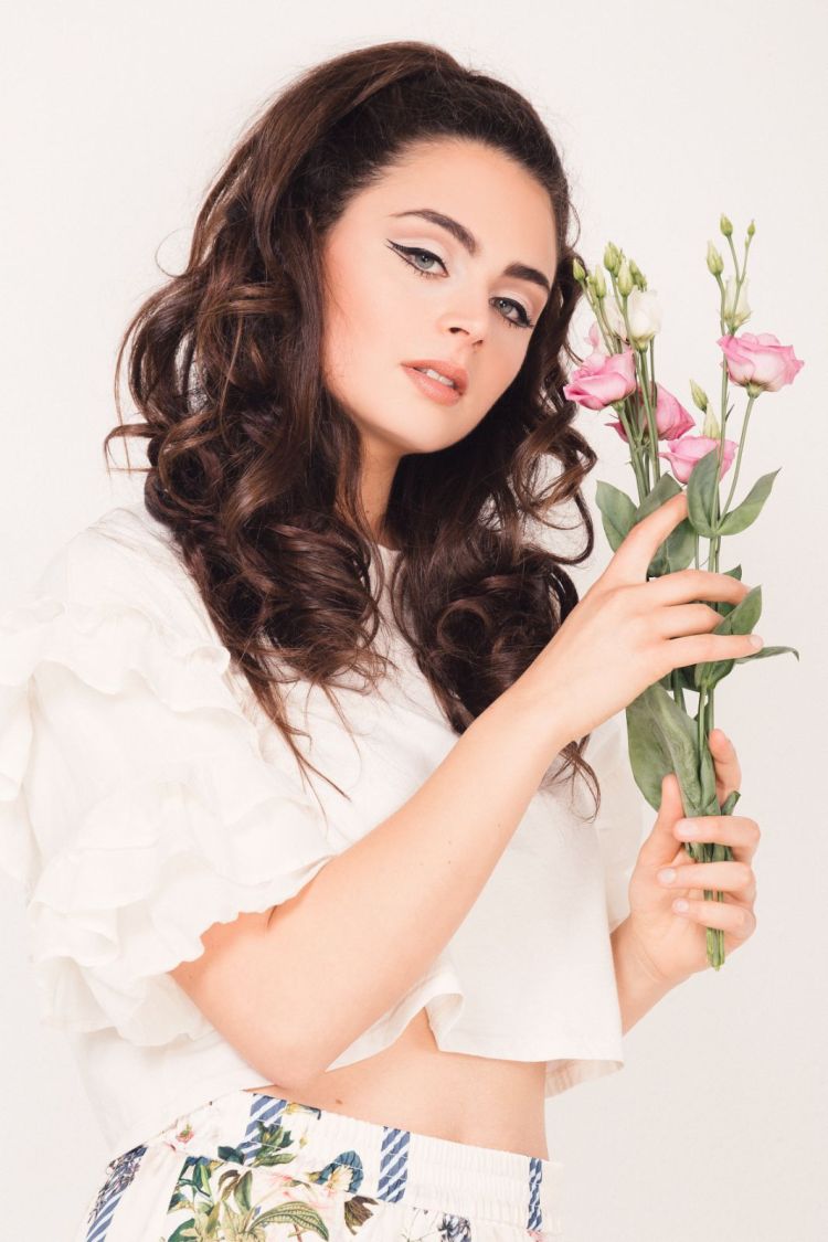Per Lucrezia ho studiato un look anni’60 /’70 elaborando un acconciatura voluminosa con una piega mossa poi ho giocato con le linee di eyeliner che caratterizzano gli occhi di quegli anni.